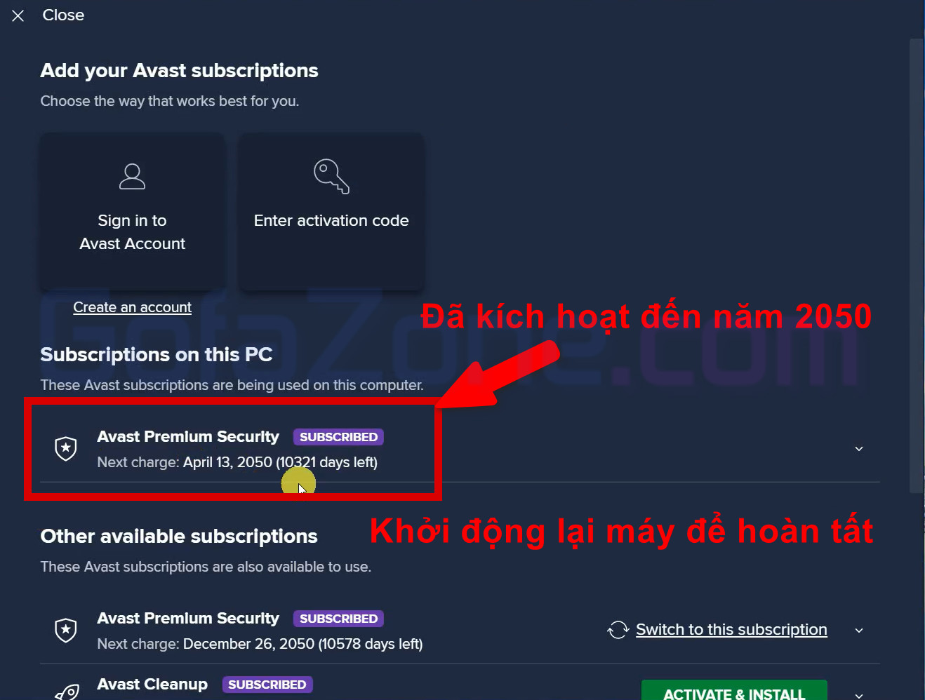 Như các bạn thấy phía dưới. Phần mềm đã được kích hoạt đến năm 2050. Bạn cần khởi động lại máy để hoàn tất việc cập nhật lên phiên bản Avast Premium Security.
