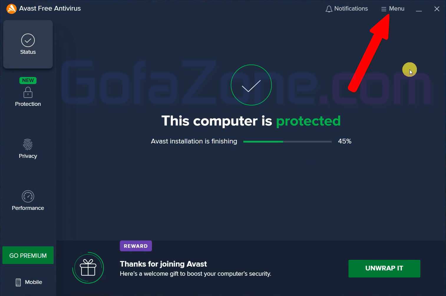 Phần mềm Avast được mở lên, bạn bấm vào nút Menu như hình bên dưới.