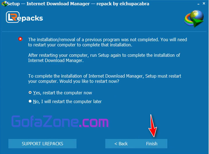 Nếu đến bước trên mà không hiện thanh chạy cài đặt mà hiện như hình dưới đây thì bạn chọn Finish nhé. Đây là do bạn đã gỡ bỏ phiên bản IDM trước đó, nhưng chưa hoàn tất. Bạn chỉ cần khởi động lại máy tính và chạy lại file cài đặt thôi.
