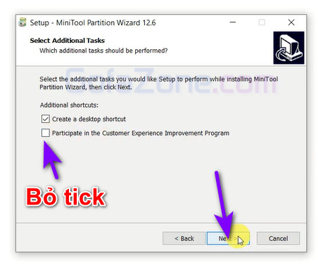 Bỏ tick ô bên dưới và click Next