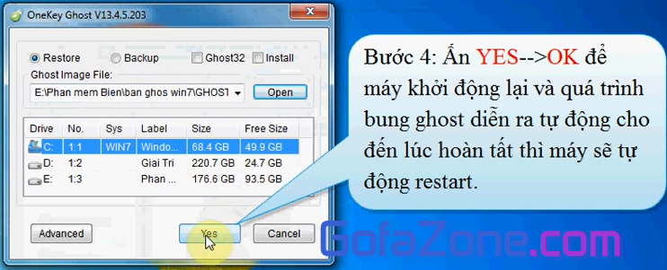 Chọn Yes –> OK. Máy tính sẽ tiến hành khởi động lại và quá trình bung Ghost sẽ diễn ra tự động.