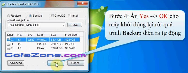 Ấn Yes –> OK. Máy sẽ tự động khởi động lại và tiến hành tạo bản Ghost.
