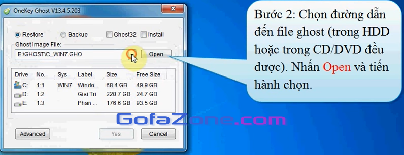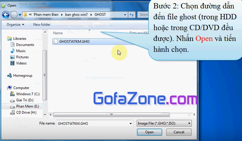 Nhấp Open và tìm đến file Ghost mà bạn đã download hoặc backup trước đó.
