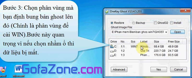 Tiếp đến là chọn phân vùng mà bạn định bung bản Ghost, thường là ổ đĩa C. Chú ý chọn đúng ổ cứng nếu không dữ liệu sẽ bị mất.