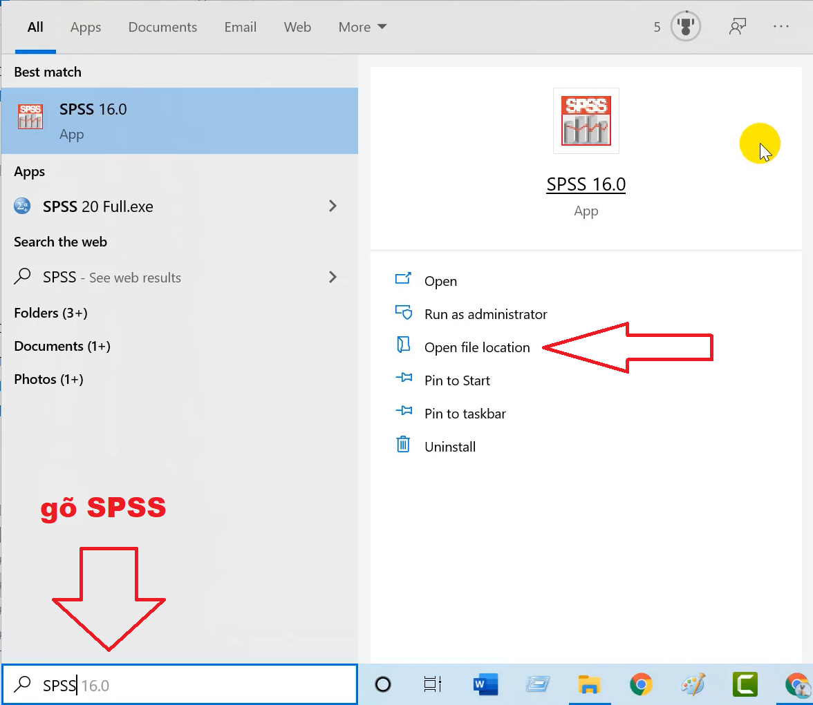 Gõ SPSS 16.0 vào thanh tìm kiếm ở Taskbar. Chọn Open file location.