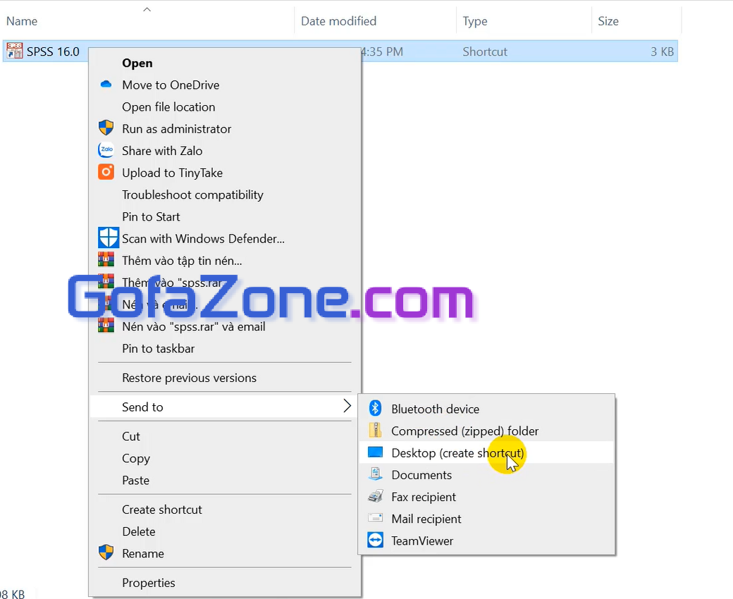 Nhấp chuột phải vào biểu tượng SPSS 16.0 và chọn Sent to > Desktop