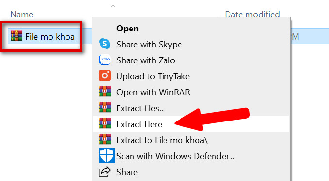 Sau khi tải về, cả file cài đặt và file mở khóa bạn CẦN GIẢI NÉN RA HẲN RỒI MỚI CÀI NHÉ, bạn hãy dùng WinRAR giải nén ra nhé. Giải nén bằng cách nhấp chuột phải vào file, chọn Extract Here, file chứa pass giải nén đã có ở bên trong file tải về của bạn.