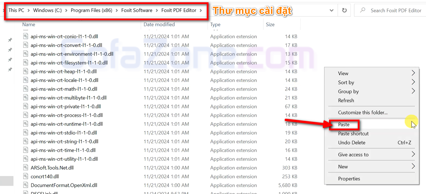Sau khi vào thư mục cài đặt như hình bên dưới. Nhấp chuột phải chọn Paste để dán các file đã copy ở trên vào đây.
