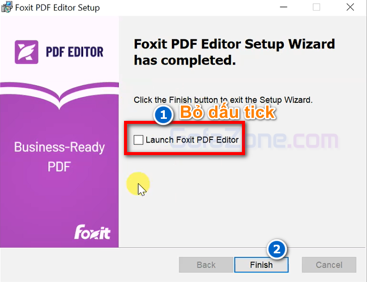 Bỏ dấu tích ở ở ô Launch Foxit PDF Editor rồi bấm Finish. Nếu bạn quên bỏ dấu tích, phần mềm sẽ được mở lên, lúc này bạn hãy đóng phần mềm Foxit PDF Editor, rồi mới chuyển sang bước kích hoạt nhé.