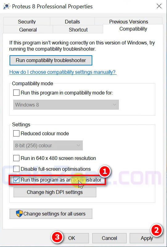 Bấm qua tab Compatibility. Tích chọn vào ô Run this program as an administrator. Rồi bấm Apply > OK.