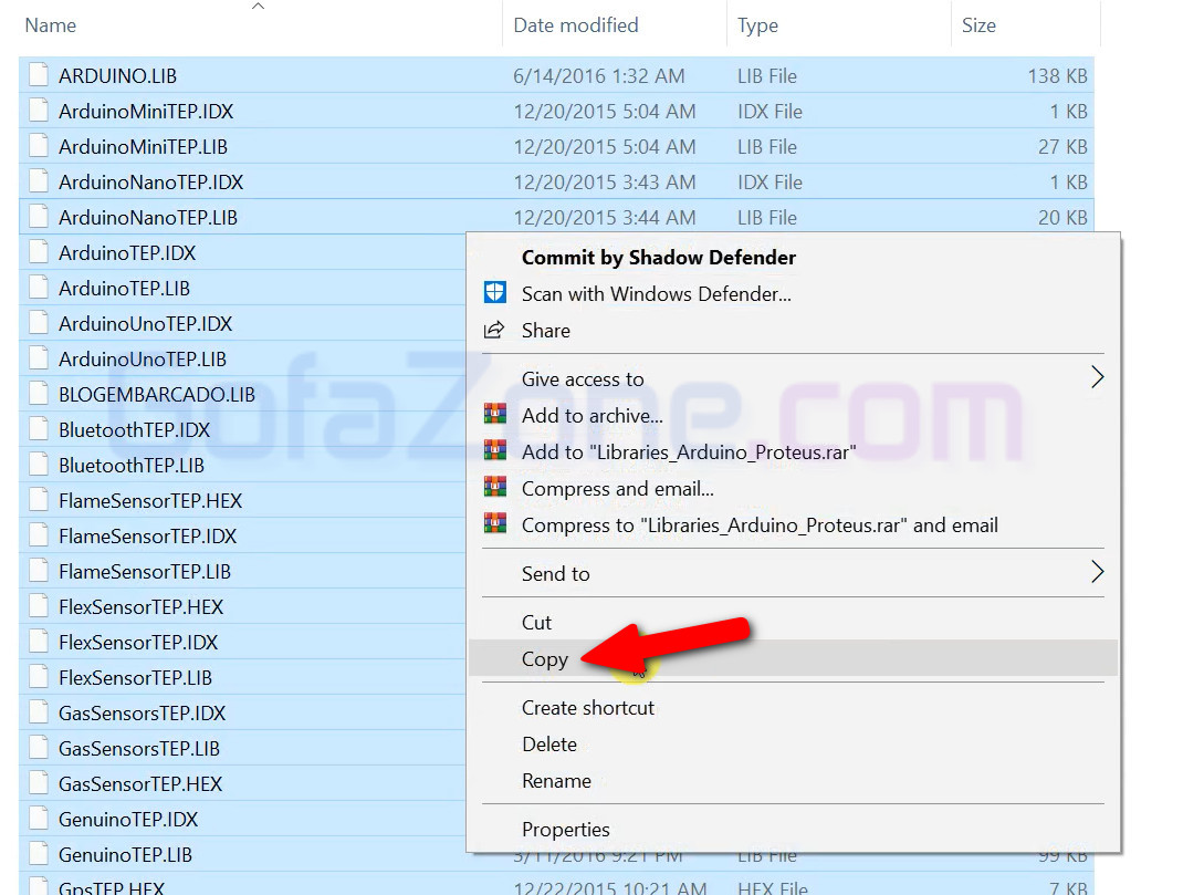 Vào thư mục Libraries_Arduino_Proteus (trong thư mục mà bạn đã tải về). Nhấn Ctrl + A để chọn tất cả các file, sau đó nhấp chuột phải và chọn Copy.