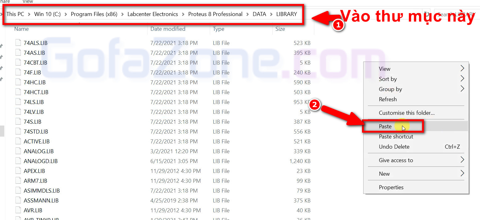 Bạn vào ổ đĩa C tìm đến thư mục có đường dẫn như hình vòng đỏ bên dưới. Nhấp chuột phải vào một vùng trống và chọn Paste để dán các file đã copy ở trên vào đây. Như vậy là bạn đã thêm thư viện Arduino vào Proteus thành công.
