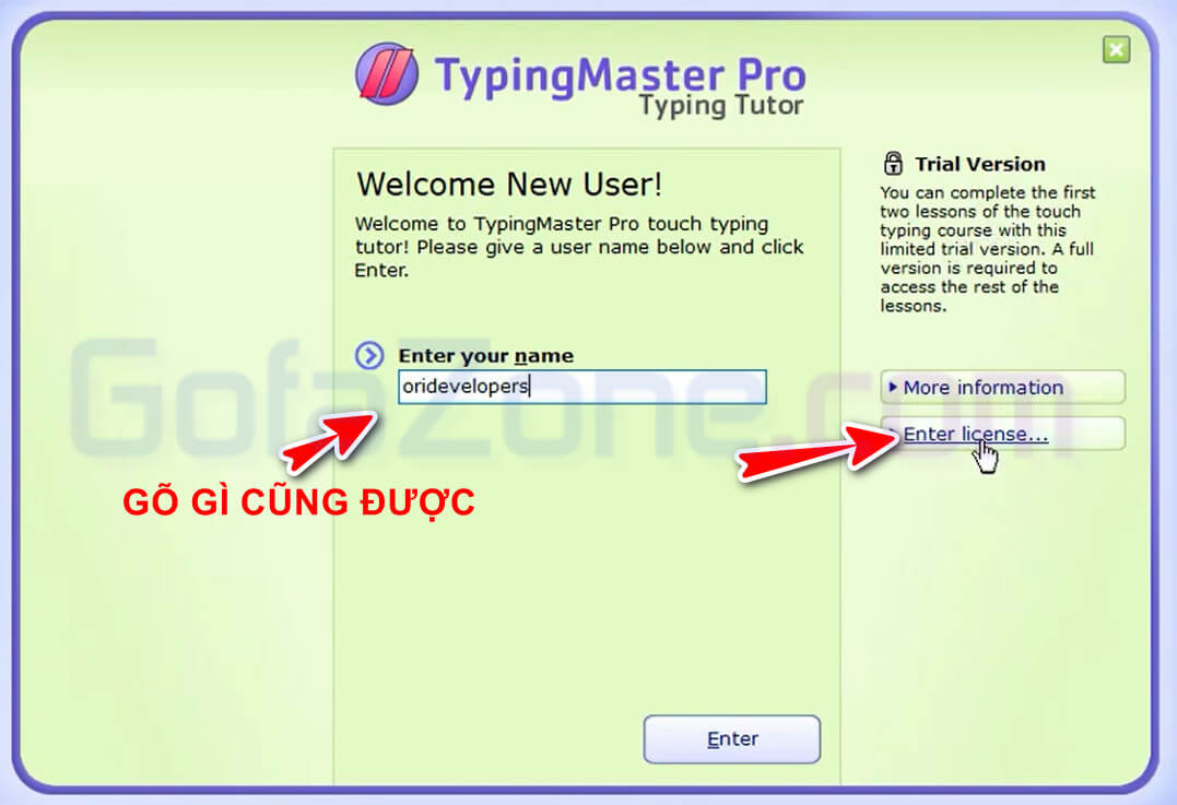 Phần mềm TypingMaster Pro 10 được mở lên. Ở ô Enter your name, bạn gõ gì cũng được. Xong thì bấm dòng chữ Enter license…