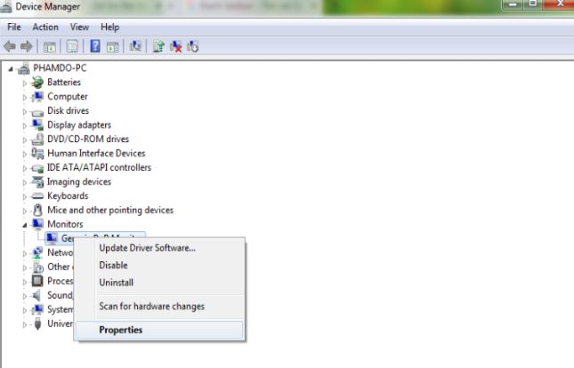 Sau khi đã bật lên, hãy chọn vào Monitor > click chuột phải vào mục Generic PnP Monitor > Properties.